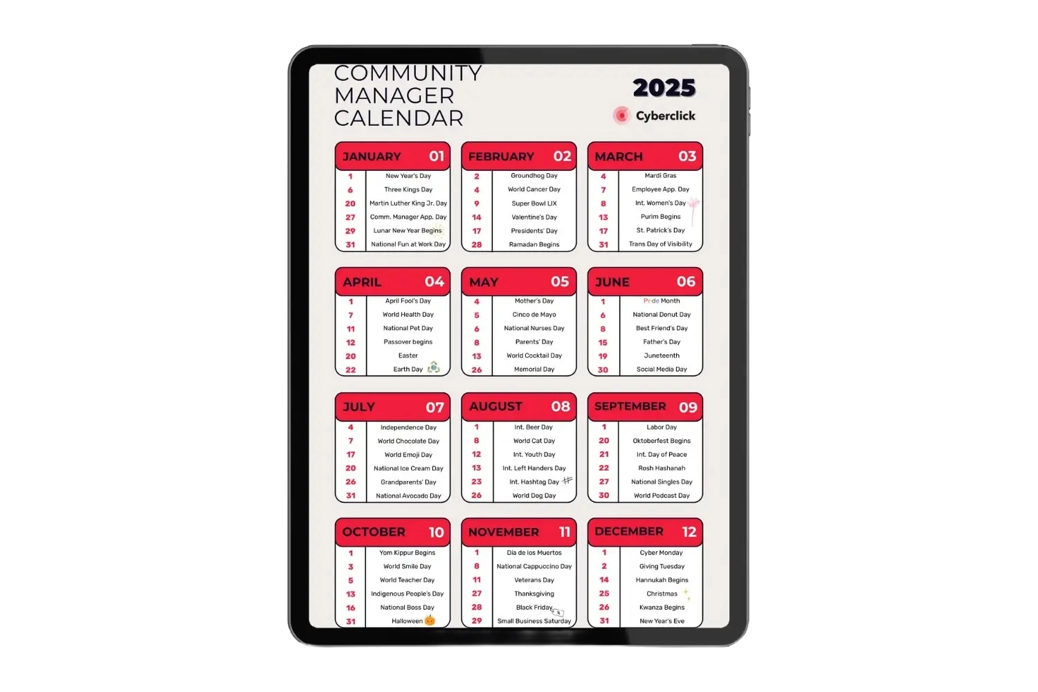 Let's face it - designing high-quality social media content takes lots of time, planning, and awareness of what's happening in the world and online. We've created this 2025 community manager calendar to help your next social media strategy meeting go a little smoother.